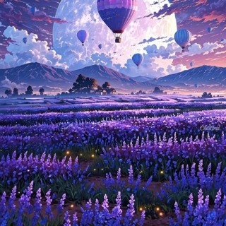 Lanskap fantasi yang menampilkan ladang lavender di bawah langit senja penuh balon udara dan bulan purnama bercahaya. Warna-warna dramatis dan orbs bercahaya menciptakan suasana magis dan menenangkan.