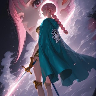 Seorang pendekar wanita berambut pink dengan jubah teal dan pedang bercahaya berdiri gagah di latar berkabut mistis. Komposisi berlapis menampilkan wajahnya secara dramatis, menciptakan nuansa fantasi yang intens.