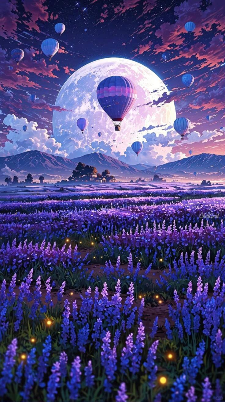Lanskap fantasi yang menampilkan ladang lavender di bawah langit senja penuh balon udara dan bulan purnama bercahaya. Warna-warna dramatis dan orbs bercahaya menciptakan suasana magis dan menenangkan.