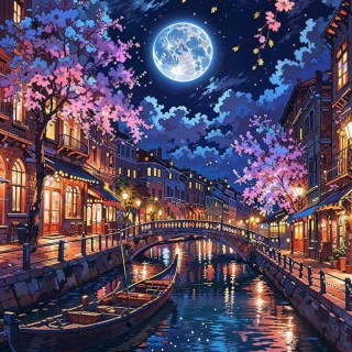 Ilustrasi malam yang memukau menampilkan kanal tenang dengan pohon sakura bermekaran, bangunan hangat, dan bulan purnama yang bersinar di langit biru gelap. Refleksi cahaya dan warna menciptakan suasana romantis dan damai.